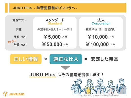 JUKU Plus!は、これまでの「情報の集約」「仕入の集約」を体系化し、より実践的かつ塾経営で求められているものを厳選して、ご提供します。