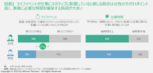 ●調査に回答した女性起業家の半数程度が結婚、出産育児、介護などのライフイベントが仕事にネガティブに影響すると感じている(図表2)