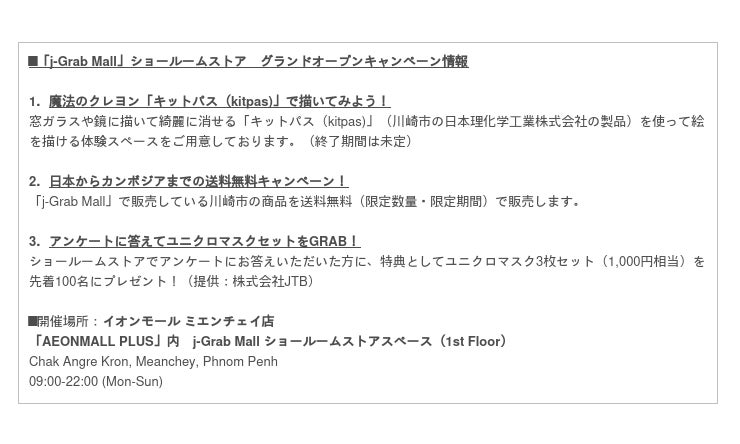 グランドオープンに合わせて、「魔法のクレヨン「キットパス(kitpas)」で描いてみよう!」(体験スペース)をはじめ、「日本からカンボジアまでの送料無料キャンペーン」、「アンケートに答えてユニクロマスクセットをプレゼント!」も実施します。