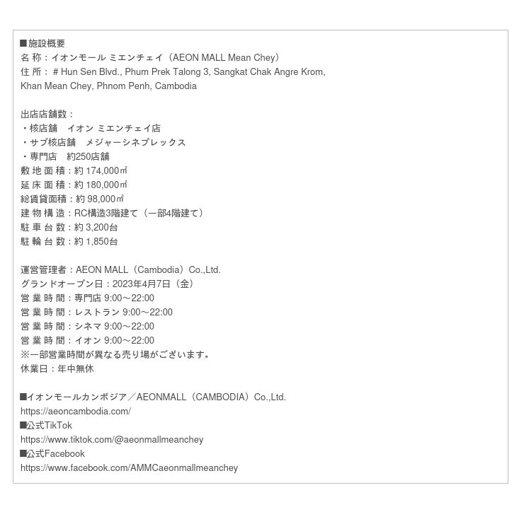 カンボジア王国でのイオンモール3号店となるイオンモール ミエンチェイは、首都プノンペンから続く主要道路、フンセン通りに面したプノンペン都ミエン チェイ区にあります。