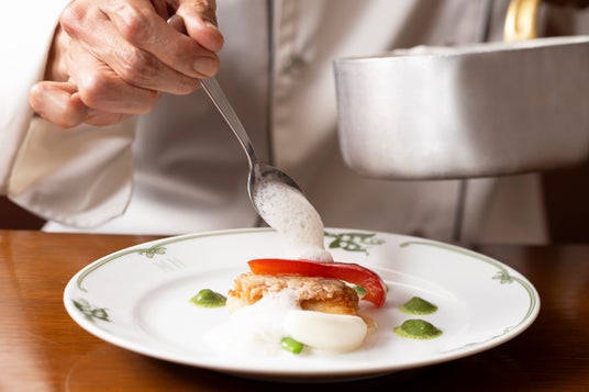 万平ホテルにてこれまで皆様に愛されてきた、じっくりと時間をかけて生み出される重厚感あふれるクラシカルフレンチ。この度新料理長に、フランスの星付きレストランをはじめ、数々のレストランで腕を磨いてきた大橋進を迎え、その伝統を受け継ぎつつ「地産地消」や「アロマ」の要素を取り入れた、より軽やかで素材の味わいが引き立つ品々に仕上げました。