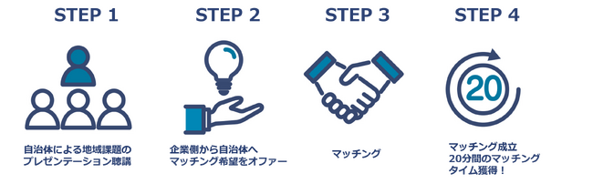 地域課題を持つ「地方自治体」と、地方での新規事業創出や自社の技術を活かした事業展開を模索する「企業」が出会える場として「自治体×企業マッチングイベント」を開催しています。イベントは、オンライン開催で2部構成です。1部は「プレゼン日」で、地方自治体が企業へ向けて地域課題や地域資源をプレゼンし、2週間後の2部は「商談日」で、企業が自社の技術を活かしてどのように地域課題を解決できるかを提案できます。