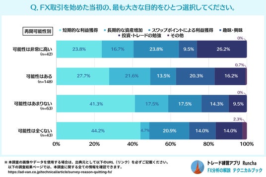 以下は、FXを始めた当初の目的を、FXの再開可能性別に集計したグラフです。