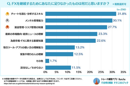 FXを継続するために足りなかったものについて質問したところ、最も多かった回答は「チャートを読む・分析するスキル」で31.8%、次いで「メンタル管理能力」で30.1%、「資金管理・リスク管理の知識」で27.7%という結果となりました。