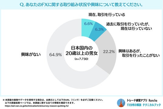 日本国内の20歳以上の男女7,730人にFXについての取り組み状況を質問したところ、FXの取引経験があるのは12.9%です。このうち、現在も取引を行っている人が6.6%、現在は取引を行っていない人は6.3%という結果となりました。