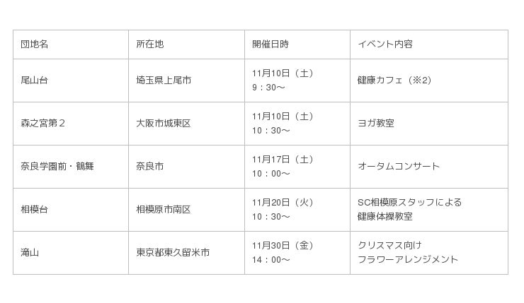 今年度は、全国15団地程度で実施予定。(11月開催予定のイベントは下記表のとおり)。各イベントに来場されたお客様に対して、50ポイントをプレゼントします。また、11月10日(土)の尾山台(埼玉県上尾市)のイベントでは、運営をお手伝いいただいたボランティアスタッフの方々にもポイントをプレゼントする予定です。