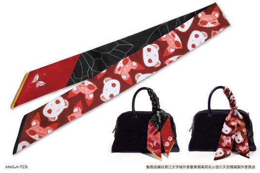 表面にはブラックベースに蝶々のラインアート、サイコロと死霊蝶を、裏面には作中に登場する「オコジョ」と「キツネ」のお面をデザインした、どちらの面でも楽しめるスカーフリボン。