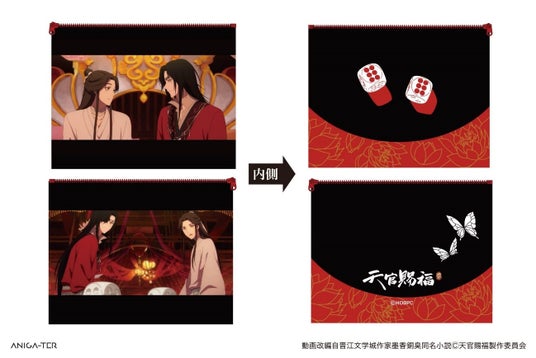 外側には「謝憐」と「花城」の場面写をプリントし、内側にはサイコロや死霊蝶をデザイン。作品の世界観が詰まったアイテム。