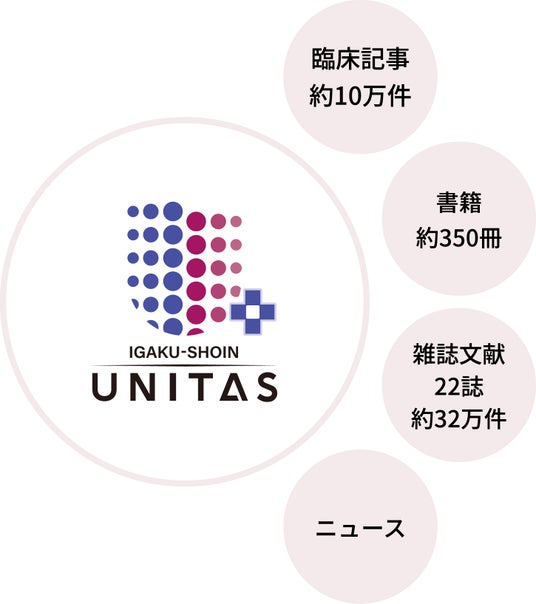 10万項目の臨床記事を集める総合診療データベース『今日の診療』をはじめ、書籍約350冊、医学雑誌22誌(文献数約32万件)、医療ニュースを含む充実のコンテンツラインナップです。