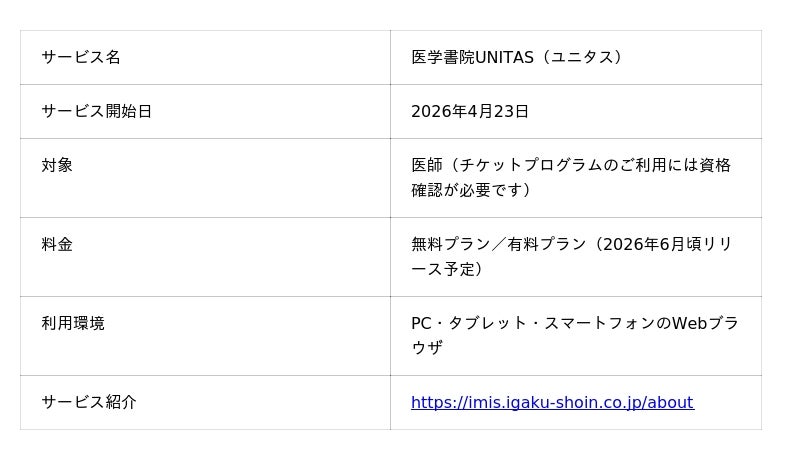 株式会社医学書院 (所在地:東京都文京区、代表取締役社長:金原 俊)は、2026年4月23日、医師のための新しいコンテンツプラットフォーム『医学書院UNITAS(ユニタス)』のサービスを開始します。