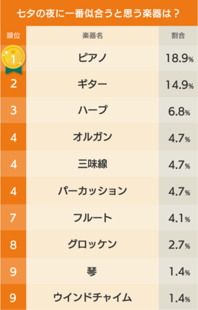 七夕の夜に一番似合うと思う「楽器」について調査したところ、幻想的な音色、天の川のイメージに合うなどの理由から、ピアノやギター、ハープが上位にランクインしました。