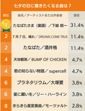 第1位【たなばたさま(童謡)】31.4% 第2位【7月7日晴れ/DREAMS COME TRUE】【たなばた/酒井格】11.4%