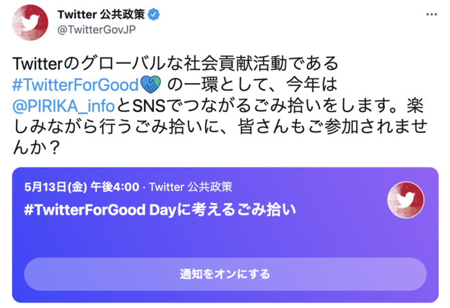 今回の「Twitter for Good Day」では、ごみ拾いを通じて地球環境を守るとともに、SNSで交流しながら楽しく活動が続けられるよう工夫をされているピリカさんと協力します。Twitterの使命は、世界中とつながり、開かれた会話を提供することです。今回の取り組みを通じて、私たちのコミュニティが美しくなるだけでなく、プラットフォーム上でごみ拾いや環境保全に関する会話が生まれ、広がっていくことを願っています。