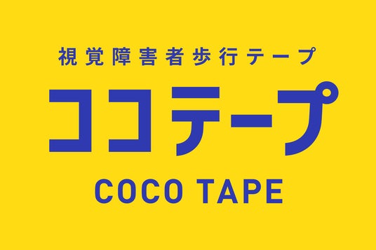 ココテープのイメージカラーであるイエローの背景にブルーのテキスト。視覚障害者歩行テープ/ココテープ/COCO TAPE