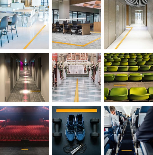 ココテープの使用例写真が9枚並んでいる。飲食店やオフィスの通路、結婚式のバージンロードでは、歩行のガイドになるように動線上に連続して配置している。ホテルの部屋のドア前、スタジアムの座席、ステージの床、スポーツジム、新幹線では目印としてポイントで配置している。