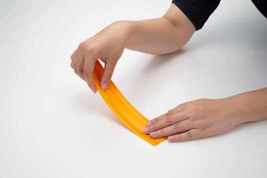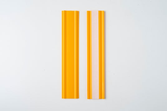 ココテープ25cmバーの写真。長さ25cmのココテープが2本並んでいて、1本は表向き、もう1本は裏面に置かれている。裏面には接着テープが付いている。本体色は鮮やかな黄色。