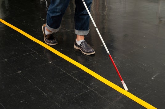 床に真っ直ぐに引かれたココテープをガイドに、白杖を持った人が歩いている。