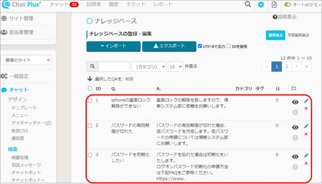 QAを入力、またはCSV形式でアップロードするだけで、AI学習します。