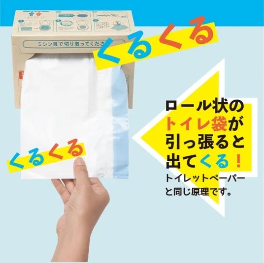 ●「くるくるトイレ」はロール状のトイレ袋をくるくると引き出して使用します。