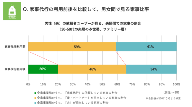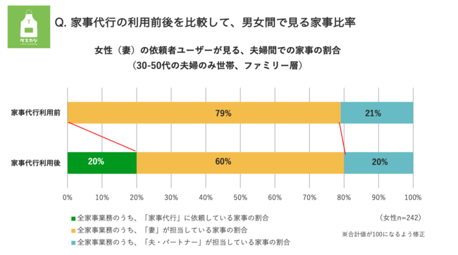 男女別で見ると、女性依頼者ユーザーの場合では、家事代行利用前の女性の家事負担は8割と非常に偏っています。家事代行の利用により女性の家事負担は6割まで低下するも、夫の家事負担は2割と依然家事負担の比率のギャップは大きく残っています。