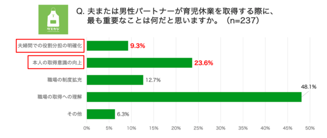 タスカジ研究所で実施した育児休業の取得についての調査(*3)では、「夫または男性パートナーが育児休業を取得する際に最も重要なこと」を聞いたところ、「職場の取得への理解」の次に、約33%の人は制度の理解や拡充といった外部環境よりも「夫自身の意識」や「家庭内での役割分担」など、家庭内の内部環境が整わないと制度があっても活用できないと考えていることがわかりました。また自由回答では、育児休業を取得する際に家庭内で何が求められているのか・何をするのか、自分で主体的に考えて動くこと、そして家事の分担がとても重要だという意見もありました。