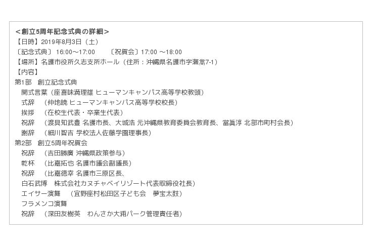 ヒューマンキャンパス高等学校(学校法人佐藤学園)は、開校5周年を記念して、8月3日(土)に沖縄県名護市役所の久志支所ホールにて、記念式典を開催いたしました。
