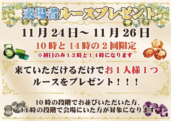 朝10時の開場にお並び頂いた方(※11/24は12時の開場にお並び頂いた方になります)、また14時時点で会場に居た方へ、来場者プレゼントとして、無料でお一人様1つルースをプレゼント!!