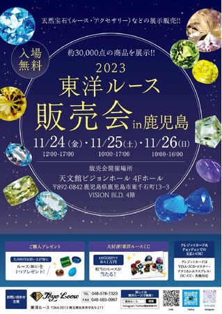 「笑顔創造」が企業理念の株式会社東洋(本社:埼玉県北本市 代表取締役/中村秀夫 以下、当社)が運営する、研磨やカットが施された、指輪などのジュエリー製品に加工される前の宝石「ルース(※裸石とも言う)」を全国の展示販売会にて1石500円から販売のしている日本最大級のルースショップ「東洋ルース」は、2023年11月24日(金)から11月26日(日)に、天文館ビジョンホール (鹿児島県鹿児島市)にて開催の自社販売会「東洋ルース販売会in鹿児島」で、鹿児島県へ初出展いたします。