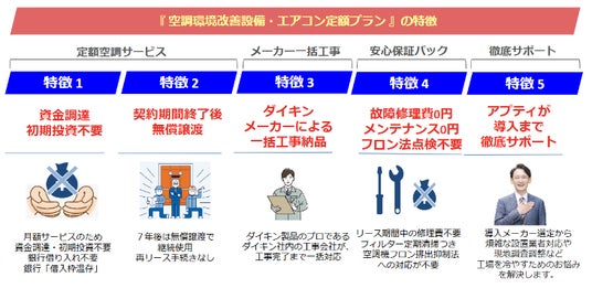 また、エアコンを導入した後の手間を軽減するため、故障修理や面倒なフィルター清掃やフロン法点検等のメンテナンスは無料で対応し、導入後の運用コストも最小限に抑えています。