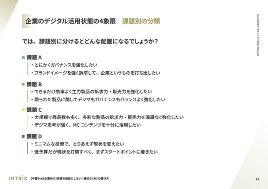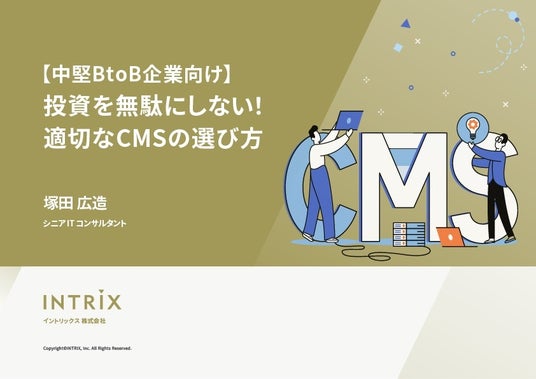 BtoB製造業のデジタルコミュニケーションを支援する、イントリックス株式会社(本社:東京都品川区、代表取締役:気賀 崇、以下 イントリックス)は、中堅BtoB企業のコンテンツ・マネジメント・システム(以下、CMS)選定・購買担当者向けに、ミドルクラスCMSに関する情報などをまとめたホワイトペーパー「【中堅BtoB企業向け】投資を無駄にしない!適切なCMSの選び方」を無料公開いたしました。(https://www.intrix.co.jp/btob-marketing-columns/downloads/btob-middle-cms/)