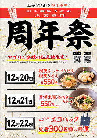 株式会社ガーデン(本社:東京都新宿区 代表取締役社長:川島賢 以下「当社」)が運営する、「山下本気うどん 大宮東口」は、2022年12月20日(火)にオープン1周年を迎えます。「山下本気うどん 大宮東口」をご愛顧くださるお客様への感謝の気持ちを込めて、「山下本気うどん 大宮東口」へご来店のお客様※を対象に、周年祭を3日間限定で開催いたします。12月20日(火)は「鶏天うどん」「鶏天ぶっかけうどん」を特別価格の税込550円で、12月21日(水)は「釜明太醬油バターうどん」を特別価格の税込550円でご提供いたします。さらに、12月22日(木)は先着300名様へ、お買い物のお供になる山下本気うどんロゴ入りエコバックを配布いたします。