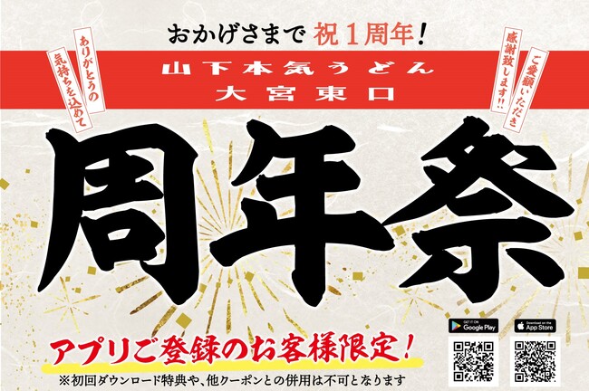 「山下本気うどん 大宮東口」は、埼玉県の山下本気うどん第一号として2021年12月20日(月)にオープンして以来、駅近という立地から地域のお客様だけでなく、県外から大宮を訪れたお客様など、多くのお客様にご愛顧いただき、1周年を迎えることができました。これを記念して、日頃からご愛顧いただいているお客様への感謝の気持ちを込めて、周年祭を開催いたします。