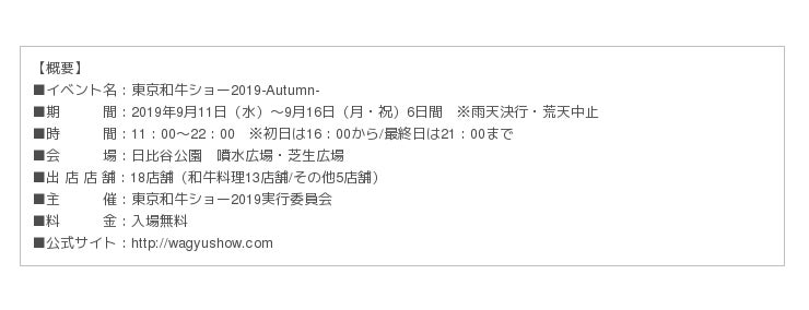 東京和牛ショー2019実行委員会は、2019年9月11日(水)~9月16日(月・祝)まで、日比谷公園(東京都千代田区)にて様々な国産和牛を堪能できる大型フードイベント「東京和牛ショー2019-Autumn-」を開催します。