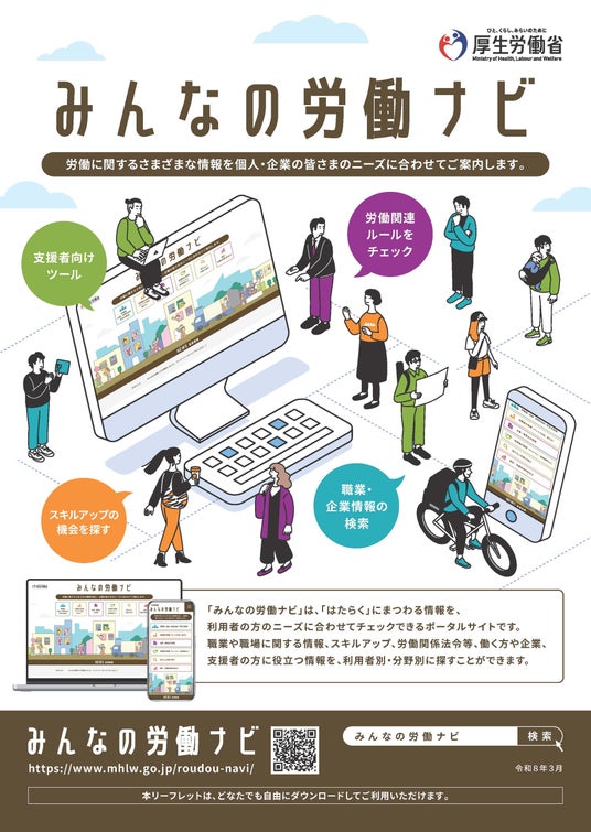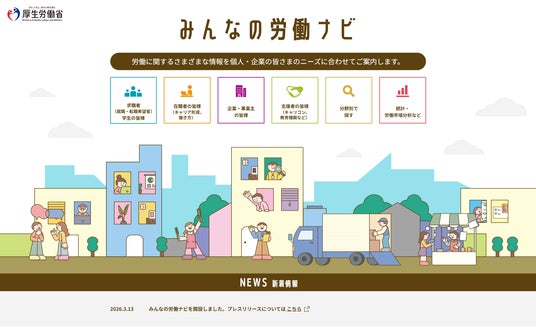 厚生労働省(所在:東京都千代田区)は、職業や職場に関する情報、スキルアップ、労働関連法令等、働く方や、企業、支援者の方に役立つ情報を、利用者別・分野別に探せるポータルサイト「みんなの労働ナビ」を公開しました。