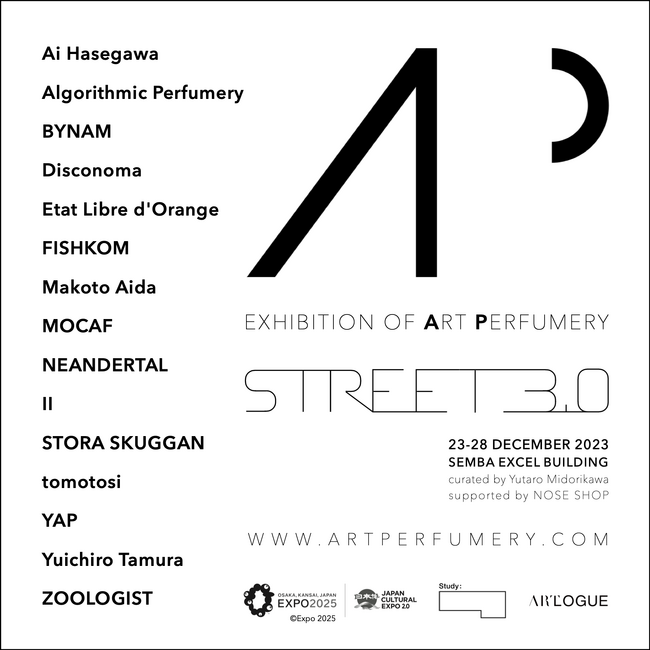 アート香水の最先端である「Art Perfumery(アートパフューマリー)」を紹介する展覧会。アートパフューマリーはそれぞれ特殊な空間をつくっている。「アート」、「香水」、「ストリート」という、一見遠い組み合わせが出会う場所、そして、多様なアートパフューマリーの世界にアクセスするための道の名前が『AP』。