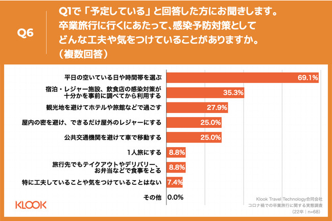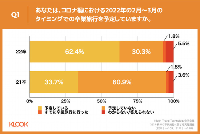 旅行・レジャー予約プラットフォームのKlook(クルック)は、2022年3月に卒業する学生109名を対象に、「コロナ禍での卒業旅行に関する実態調査」を行いましたのでお知らせいたします。この春卒業する学生で卒業旅行に行く予定と回答した人は62.4%と、昨年の調査結果と比較して28.7ポイント増加し、感染予防対策として「平日の空いている日や時間帯を選ぶ」などを挙げていました。卒業旅行予定の人の行き先は昨年同様、「北陸・東海」「大阪」がそれぞれ19.1%で最多でした。予定していない人がコロナ禍でなければ行きたかった場所は北海道、京都、沖縄が上位となる一方、「諦めている」という回答が65.2%と昨年より16.2ポイント増加しました。
