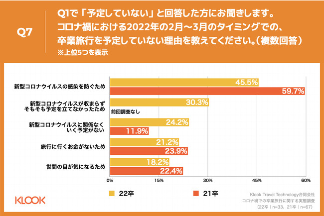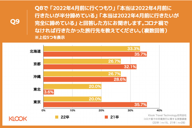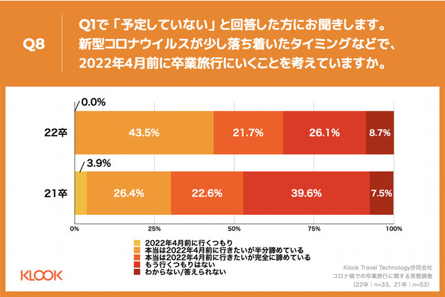 Q1で 「予定していない」と回答した方に、「Q8.新型コロナウイルスが少し落ち着いたタイミングなどで、2022年4月前に卒業旅行にいくことを考えていますか。」(n=33)と質問したところ、「本当は2022年4月前に行きたいが半分諦めている」が43.5%、「本当は2022年4月前に行きたいが完全に諦めている」が21.7%という回答となりました。21卒(n=53)と比較し、「本当は2022年4月前に行きたいが半分諦めている」が17.1ポイント増という結果になりました。