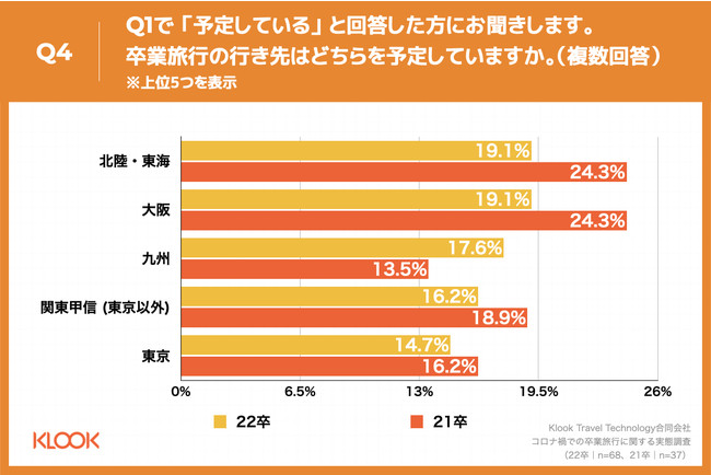 Q1で「予定している」と回答した方に、「Q4.卒業旅行の行き先はどちらを予定していますか。(複数回答)」(n=68)と質問したところ、「北陸・東海」が19.1%、「大阪」が19.1%、「九州」が17.6%という回答となりました。21卒(n=37)と比較し、「北陸・東海」、「大阪」がそれぞれ5.2ポイント減という結果になりました。
