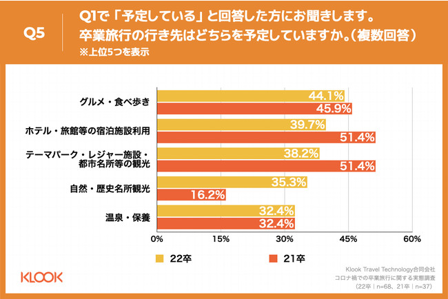 Q1で「予定している」と回答した方に、「Q5.卒業旅行では、どのようなプランを考えていますか。(複数回答)」(n=68)と質問したところ、「グルメ・食べ歩き」が44.1%、「ホテル・旅館等の宿泊施設利用」が39.7%、「テーマパーク・レジャー施設・都市名所等の観光」が38.2%という回答となりました。21卒(n=37)と比較し、「ホテル・旅館等の宿泊施設利用」が11.7ポイント減、「自然・歴史名所観光」が19.1ポイント増という結果になりました。
