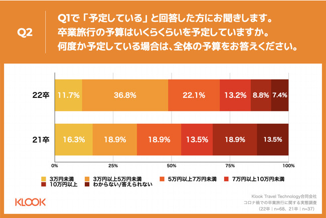 Q1で「予定している」と回答した方に、「Q2.卒業旅行の予算はいくらくらいを予定していますか。何度か予定している場合は、全体の予算をお答えください。」(n=68)と質問したところ、「3万円以上5万円未満」が36.8%、「5万円以上7万円未満」が22.1%という回答となりました。21卒(n=37)と比較し、「3万円以上5万円未満」が、17.9ポイント増という結果になりました。昨年より行く人は増えた一方で、予算は抑える傾向が強いようです。