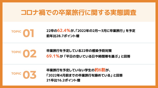 ■22卒の卒業旅行、「2月~3月には行く予定」と回答した学生は62.4%(21卒比28.7ポイント増)