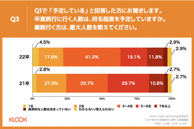 Q1で「予定している」と回答した方に、「Q3.卒業旅行に行く人数は、何名程度を予定していますか。複数行く方は、最大人数を教えてください。」(n=68)と質問したところ、「2名」が17.6%、「3~4名」が41.2%、「5~6名」が19.2%という回答となりました。21卒(n=37)と比較し、「3~4名」が、11.5ポイント増という結果になりました。