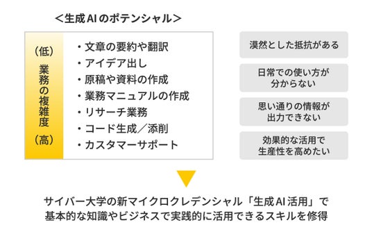 サイバー大学(学長:川原 洋、所在地:福岡市東区、以下「本学」)は、2025年度春学期から、生成AIをビジネスで活用する実践的スキルを身に付ける「生成AI活用」の教育プログラムを新たに開講します。本プログラムでは、AIの技術そのものを深く学ぶ従来の情報工学的なアプローチとは異なり、ビジネスにおいて必要不可欠なツールとして、生成AIの基本的な活用やその応用に焦点を当てています。生成AIを、今すぐ実務に役立てたい方に向けて、実践的で応用力の高いプログラムを提供します。