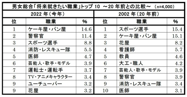 子どもの将来就きたい職業の総合ランキングは、「ケーキ屋・パン屋」が1位となりました。20年前のランキングと比較すると、2位「警察官」、4位「消防・レスキュー隊」、5位「医師」など、人を助ける職業が大きく順位を上げています。9位の「ユーチューバー」は、2016年に初めて登場して以来、順位も比率も右肩上がりで人気を集めています。