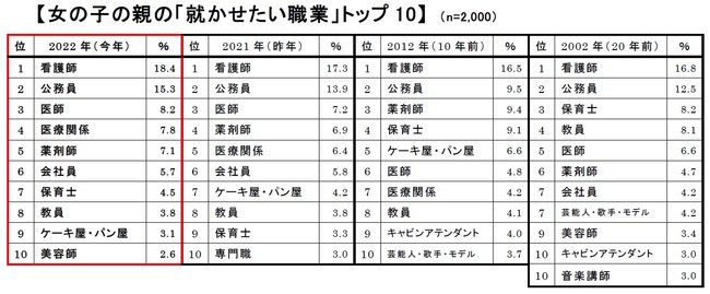 安定を願う気持ちの表れか、13年連続で「公務員」が1位となりました。4位「スポーツ選手」と5位「消防・レスキュー隊」は、男の子のランキングと同様、ともに大きく比率を伸ばし、順位を上げました。