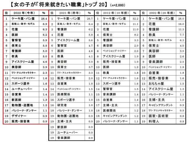 女の子の将来就きたい職業は、「ケーキ屋・パン屋」が調査開始以来24年連続で1位でした。4位「医師」、5位「警察官」が過去最高順位・比率となり、6位「保育士」、7位「教員」も昨年から順位を上げるなど、コロナ禍が続く中で、人々の生活に欠かせないエッセンシャルワーカーへの関心が高まっています。