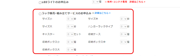ネットからお申込みの場合、契約内容の確認画面にある各種オプションより『ラック販売・組み立てサービスのお申込み』を選択してください。