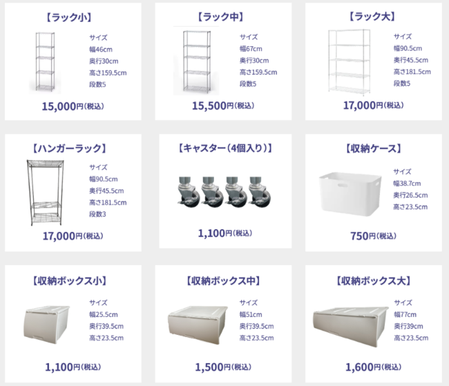 サービス開始時はラック2種類のみの展開でしたが、反響をうけて4種類に追加、そして、ラックのサイズにあった収納ボックスも販売を開始しました。