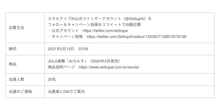 また、「AIカルタ」プレゼントキャンペーンと同時に、スキルアップAIの公式ツイッターアカウント(@SkillupAi)にてAIカルタを使ったクイズ企画も実施中です。毎日投稿を見ることで1日1つずつAIの勉強ができます。