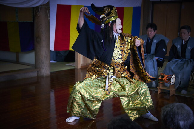 池田町に760年以上受け継がれる「水海の田楽・能舞」。鎌倉幕府第5代執権・北条時頼が雪で立ち往生した時、村人たちが「田楽」を舞い、お礼に時頼が「能」を教えたのが始まりとされています。毎年2月15日には古式に従って田楽四番と能舞五番を奉納しており、「田楽」と「能」を併せ持つこの神事は国の重要無形民俗文化財に指定されています。今回はその中から、荒ぶる神々を鎮め世界を清める田楽「あまじゃんごこ」と坂上田村麿の武勇を示す能舞「田村」を上演します。